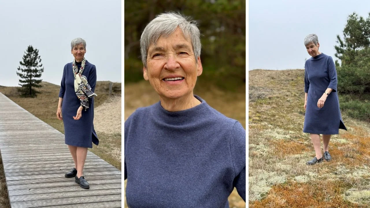 I made the HIUTALE dress for Bernhild in a size 4 from medium-weight, soft, mulesing-free merino wool jersey (235 gsm). The idea behind the dress was to create an everyday garment from wool knit with a delicate collar, no seams on the neckline and a hem that just covers the knees. The slits create a polished finish and make the overall look a bit lighter. You can use any medium-weight knit for your design, but my favourite of the three different versions I've made so far is the merino wool version for Bernhild!