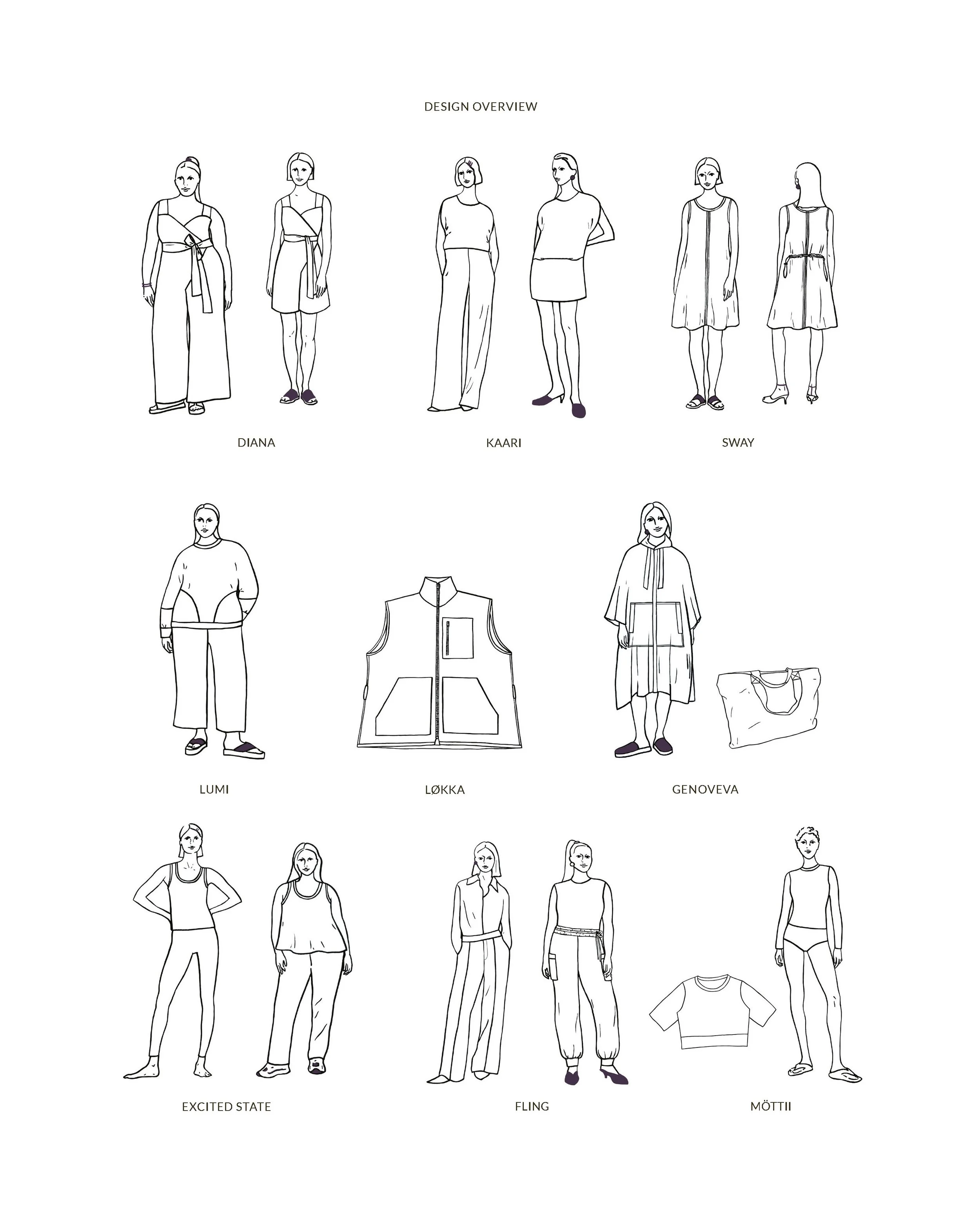 Sewing pattern designers: Marja Niemi, Lauren Merciris, Kaisa Rissanen, Stina Dahlin, Susanne Hirt, Abby Huston Olmstead, Mila Moisio, Sigrid and Solveig Holtvedt, Réka MacDonald